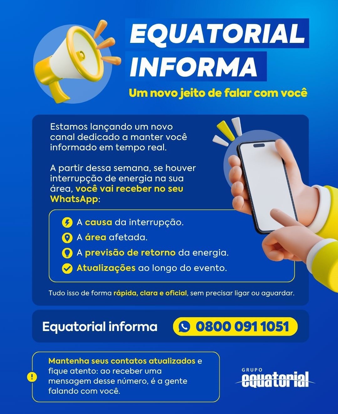 Mantenha seus contatos atualizados conosco, salve o número 0800 091 1051 e fique atento: se receber uma mensagem desse número é a gente falando com você. Mas atenção, este número não recebe ligações.